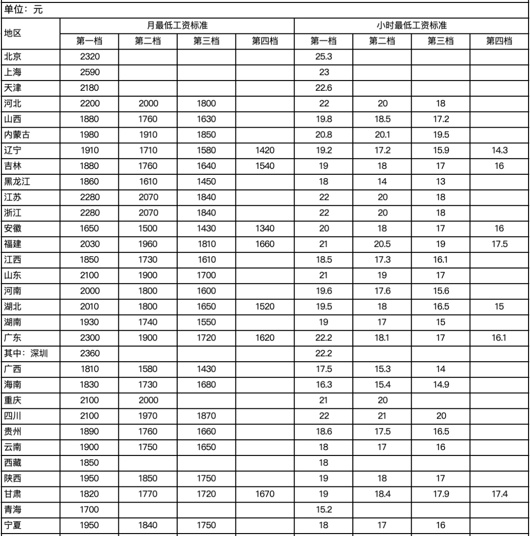 全國各地區(qū)最低工資標(biāo)準(zhǔn)情況(截至2022年2月)