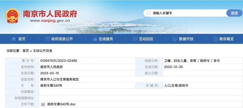 2022 年年底,南京市人民政府發(fā)布了第 340 號(hào)令,文件中明確《南京市人口與生育服務(wù)規(guī)定》已經(jīng) 2022 年12月2日市政府第 154 次常務(wù)會(huì)議審議通過,自2023年2月10日起施行。